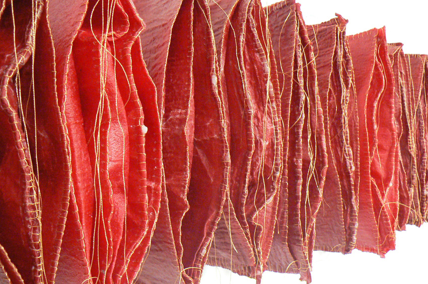 muslin, beetroot, wax & gold thread